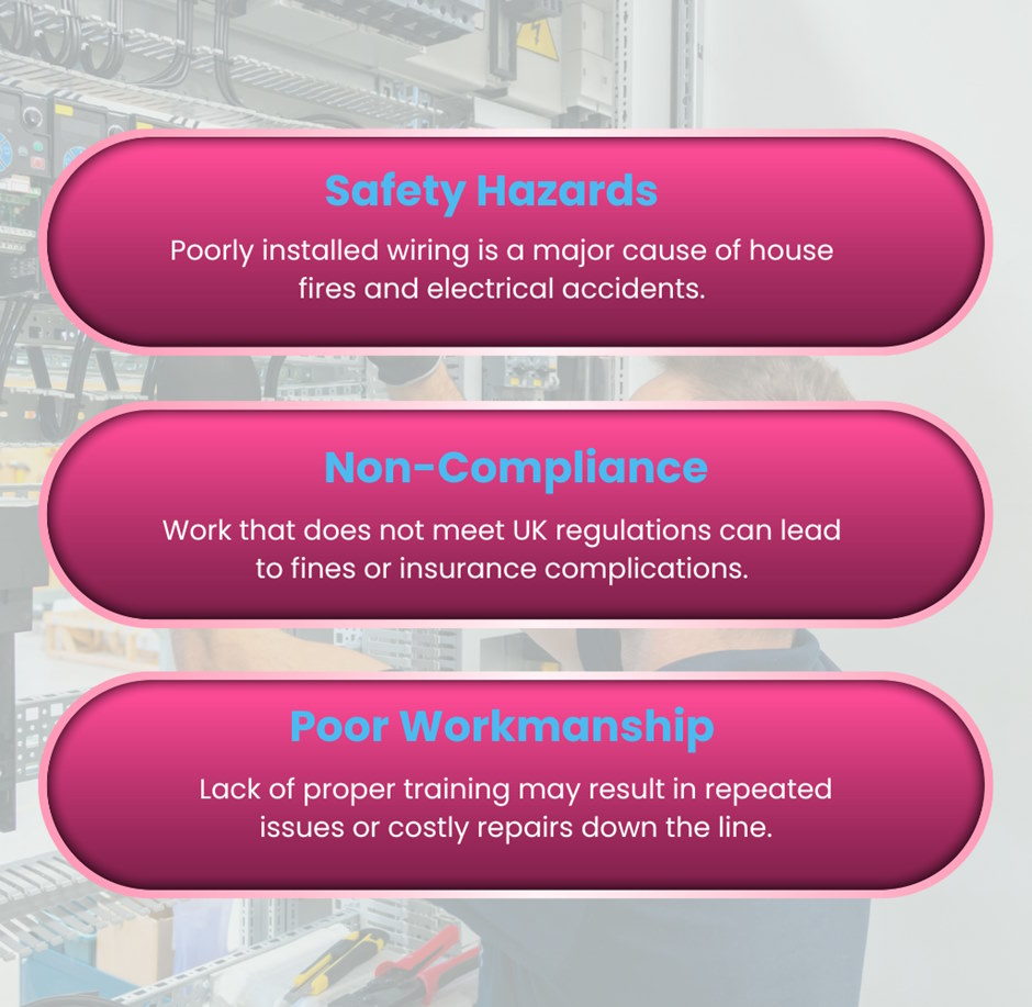 By contrast, using a NICEIC-certified electrician like Ian Hobbs Technical Services Ltd ensures that installations are safe, reliable, and fully compliant with all relevant regulations.